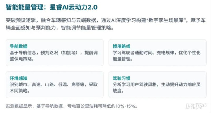 依托今年6月吉利发布的行业首个基于AI场景引擎的动力域智能体——星睿AI云动力2.0,领克10 EM-P还可实现四大核心功能:智慧能量管理(动态优化能量分配,节能提升5%)、智慧健康管理(动态保养周期,电池寿命延长15%)、智慧补能管理(智能推荐充电)、智慧运动控制(含G-CSS过弯辅助等)。