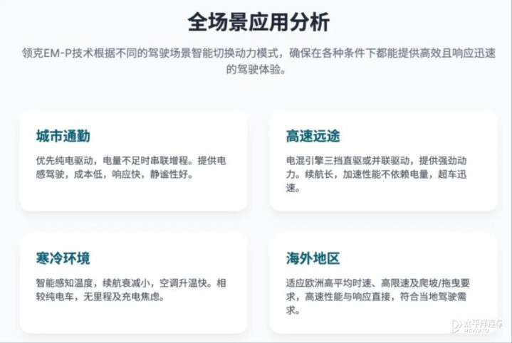上面提到的领克10 EM-P技术设计,虽然看着复杂,但回归到本质,其实是对用户多元场景需求的精准回应:通勤场景的低能耗、长途自驾游的续航、家庭出行的舒适、复杂路况的稳控,以及日常使用的智能便捷。在领克EM-P AI电混2.0的加持下,也确实做到了“让这台车怎么开、在哪开、谁来开都能省都能稳”。