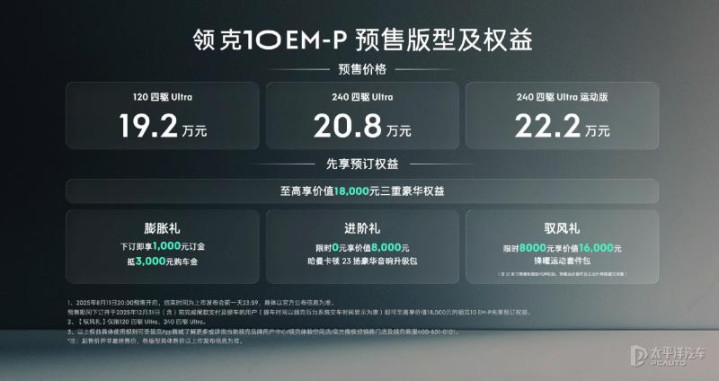 领克10 EM-P目前已经正式开启预售,新车共推出3款车型,预售价区间为19.2-22.2万元,将于9月上市。现在下订还能至高享价值18000元三重豪华权益,包括1000元订金抵3000元购车款、限时赠送价值8000元哈曼卡顿23扬声器音响升级包、限时8000元享价值16000元运动套间包等,对这款新车感兴趣的朋友不妨早日下单。